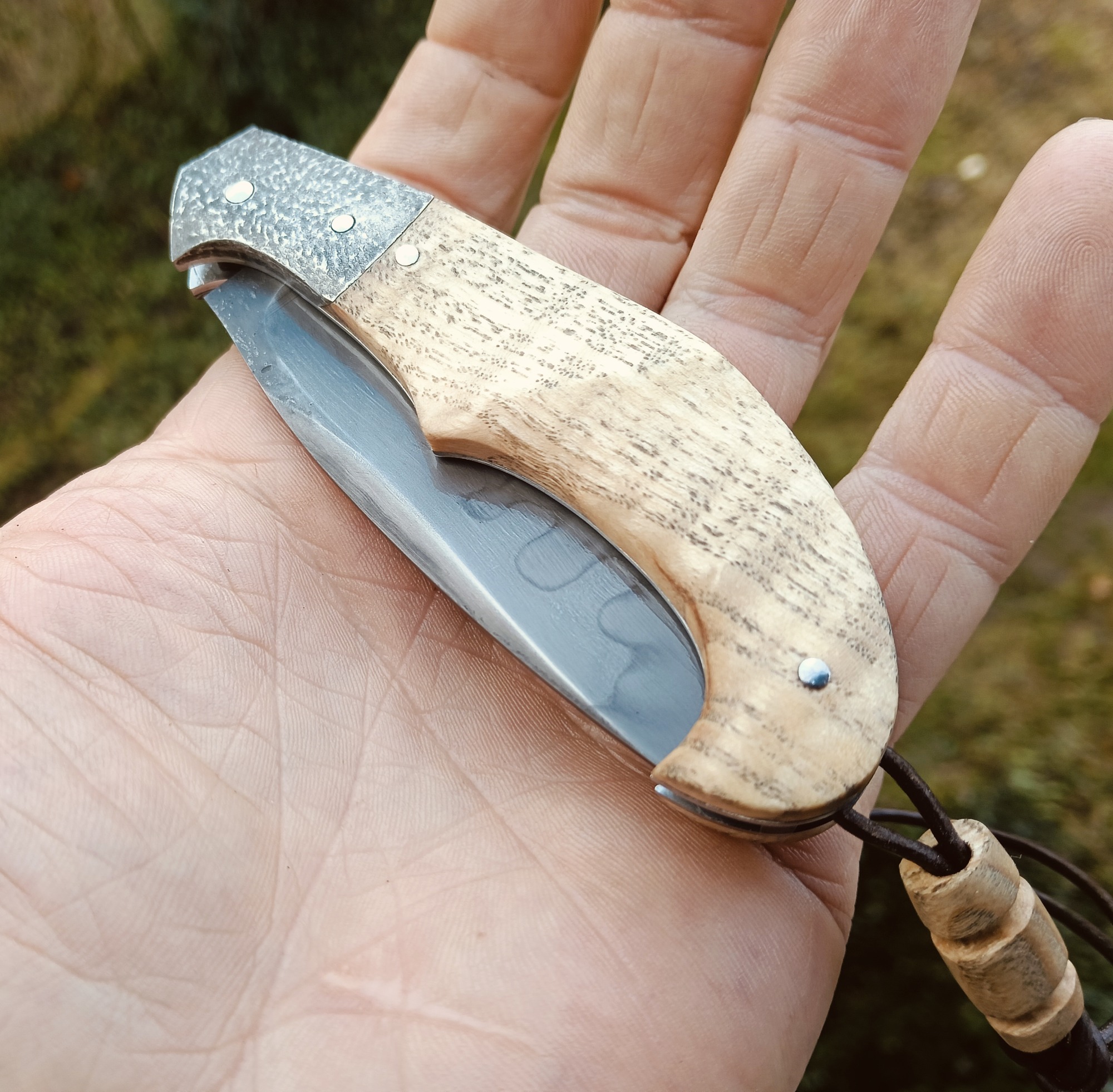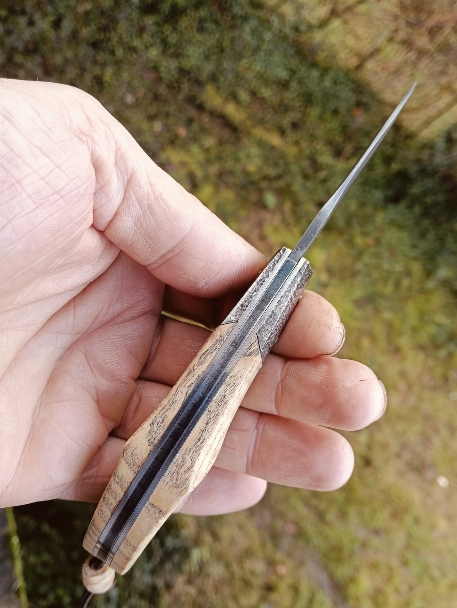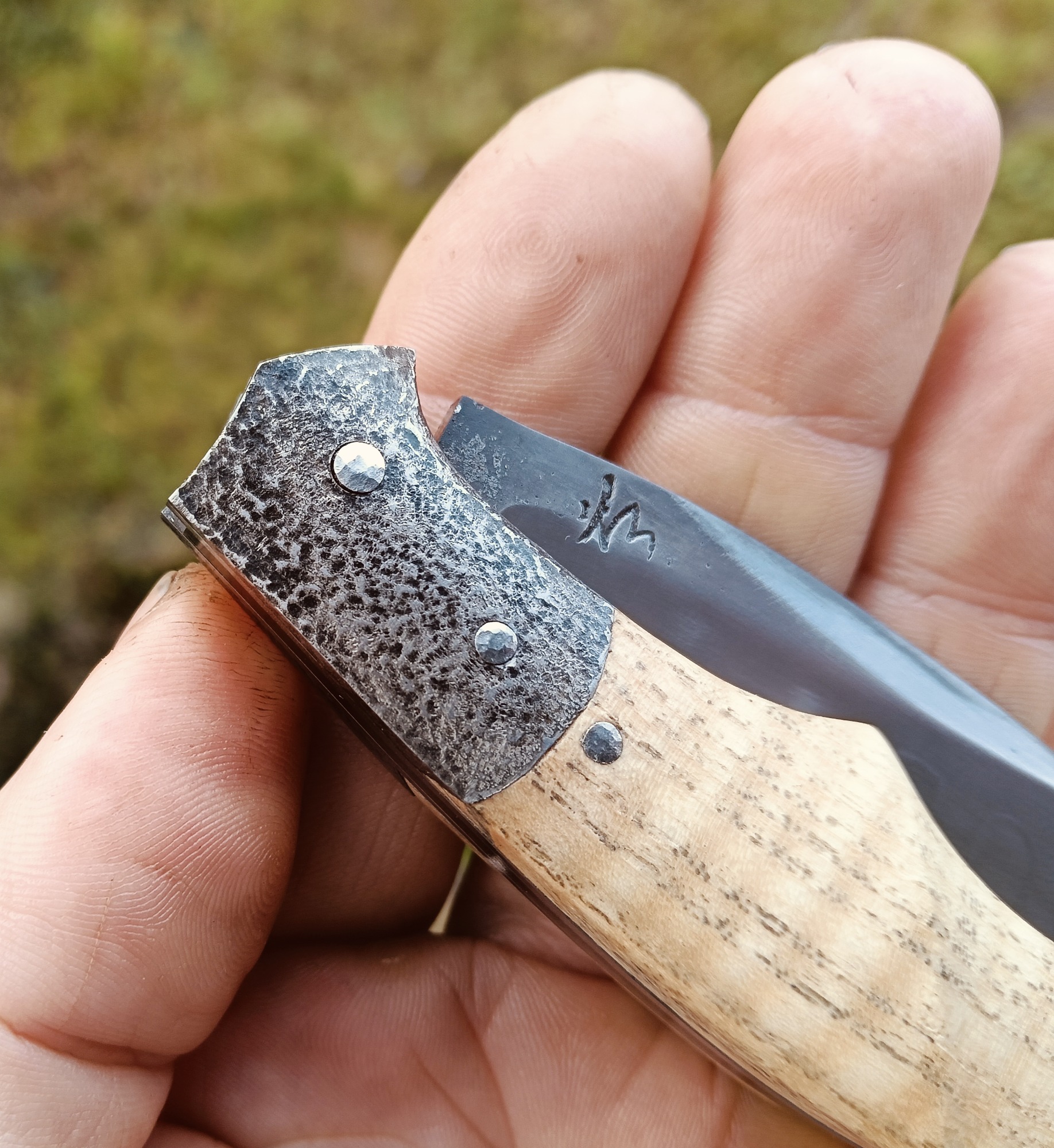 Couteau à cran forcé en acier à haute teneur en carbone 26c3 forgé à l'atelier,trempe sélèctive avec une jolie ligne de trempe , émouture creuse, rondelles de friction bronze béryllium, manche en frêne ondé sur platines inox,mitres enacie arbone trempé, texturé et patiné,ressort xc75 patiné "effet vielli",80mm de lame pour 75mm de tranchant utile.