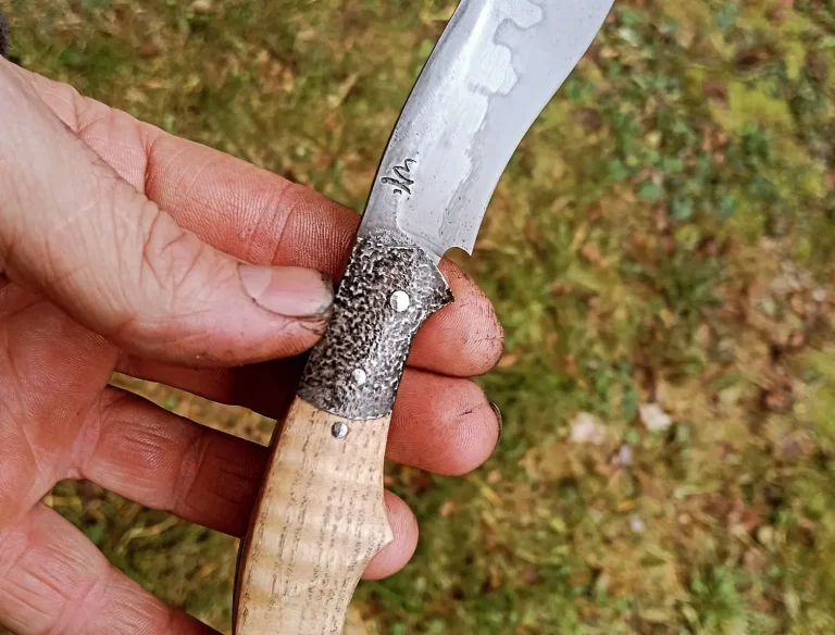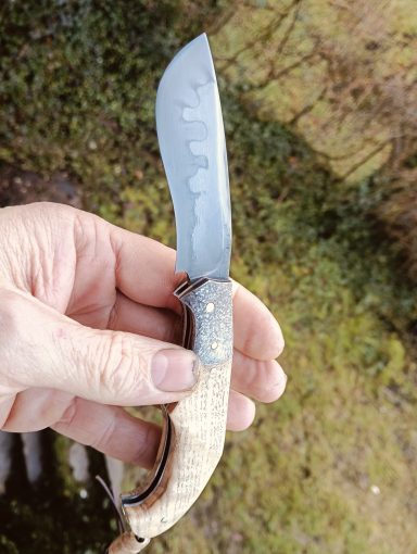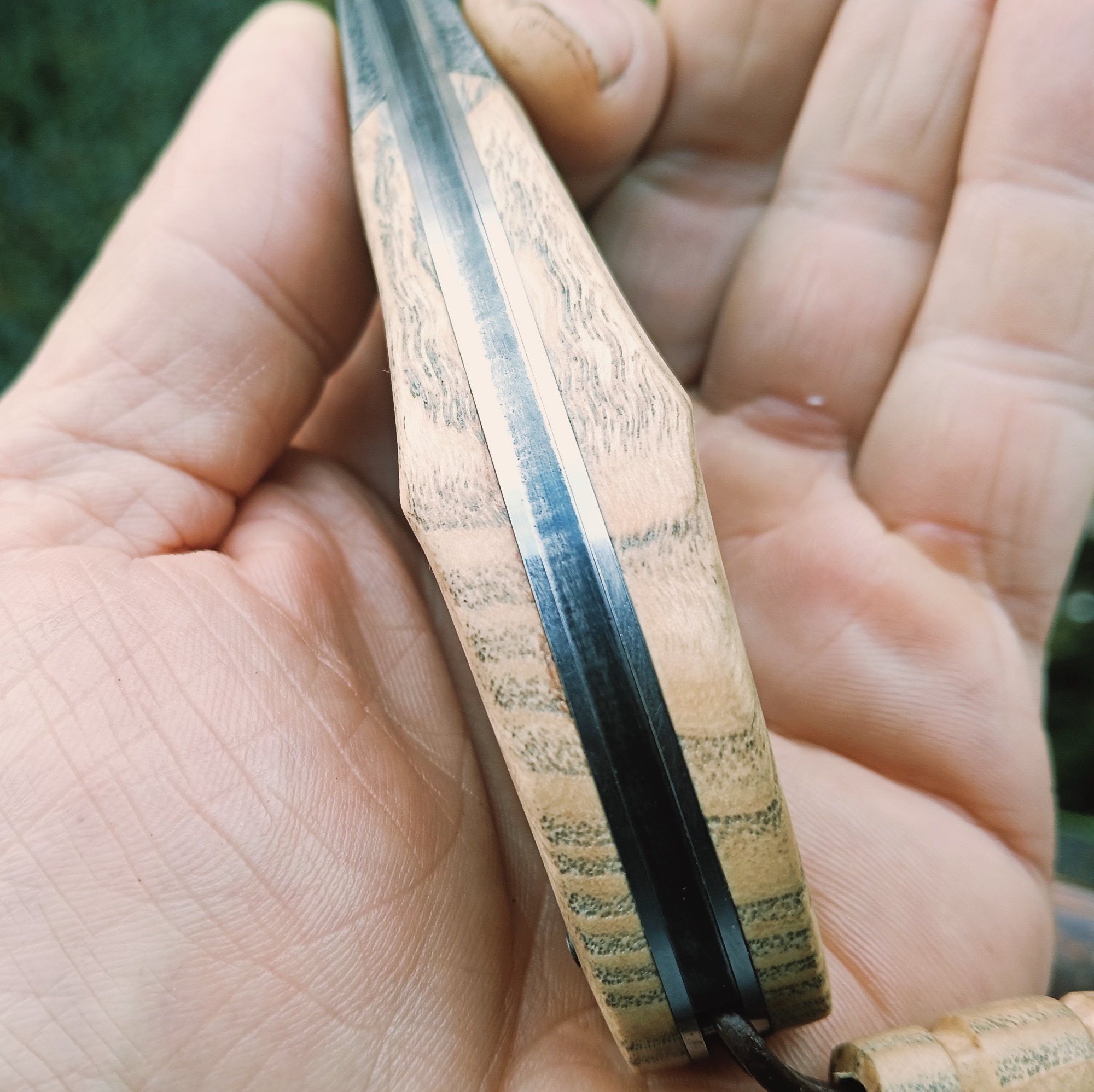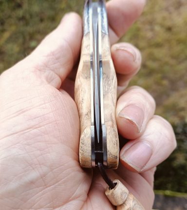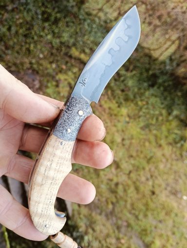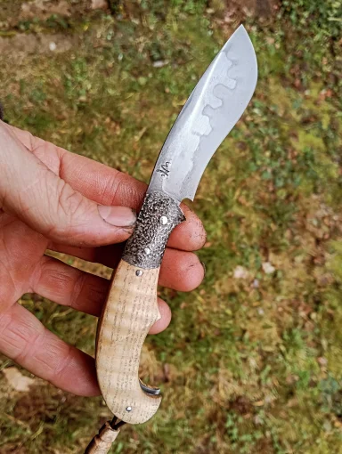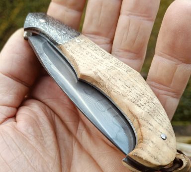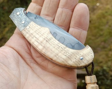 Couteau à cran forcé en acier à haute teneur en carbone 26c3 forgé à l'atelier,trempe sélèctive avec une jolie ligne de trempe , émouture creuse, rondelles de friction bronze béryllium, manche en frêne ondé sur platines inox,mitres enacie arbone trempé, texturé et patiné,ressort xc75 patiné "effet vielli",80mm de lame pour 75mm de tranchant utile.
