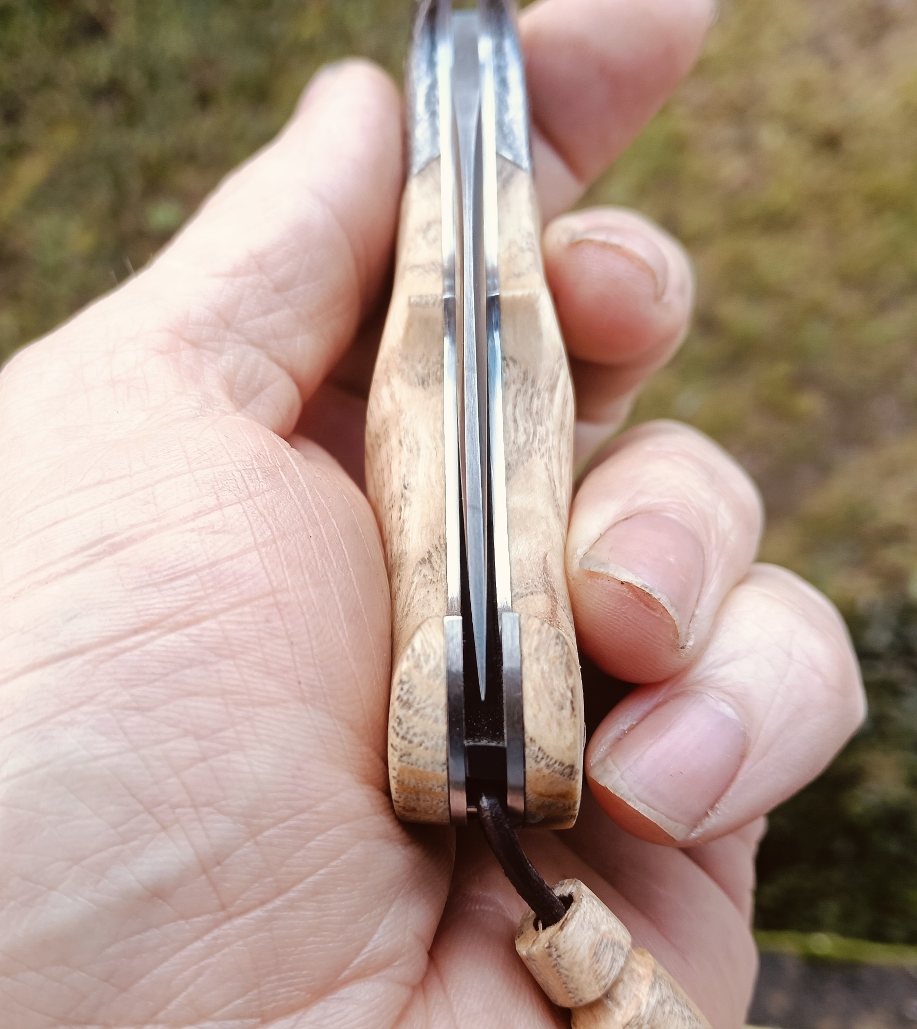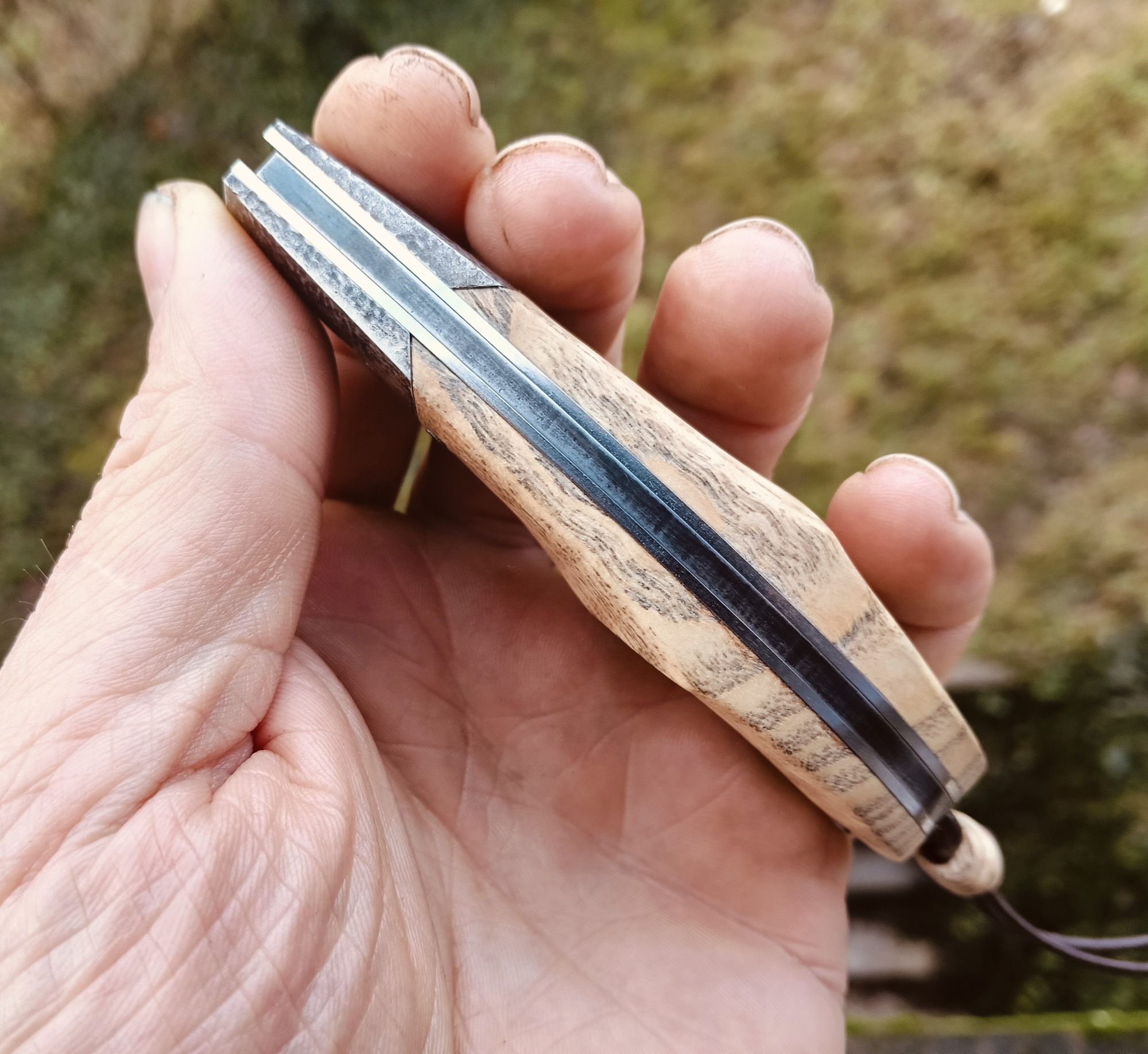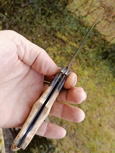 Couteau à friction en acier u10a forgé à l'atelier ,trempe sélective, émouture creuse, rondelles de friction bronze béryllium, manche monobloc en Châtaignier de Désaignes (Ardèche), 85mm de tranchant utile.